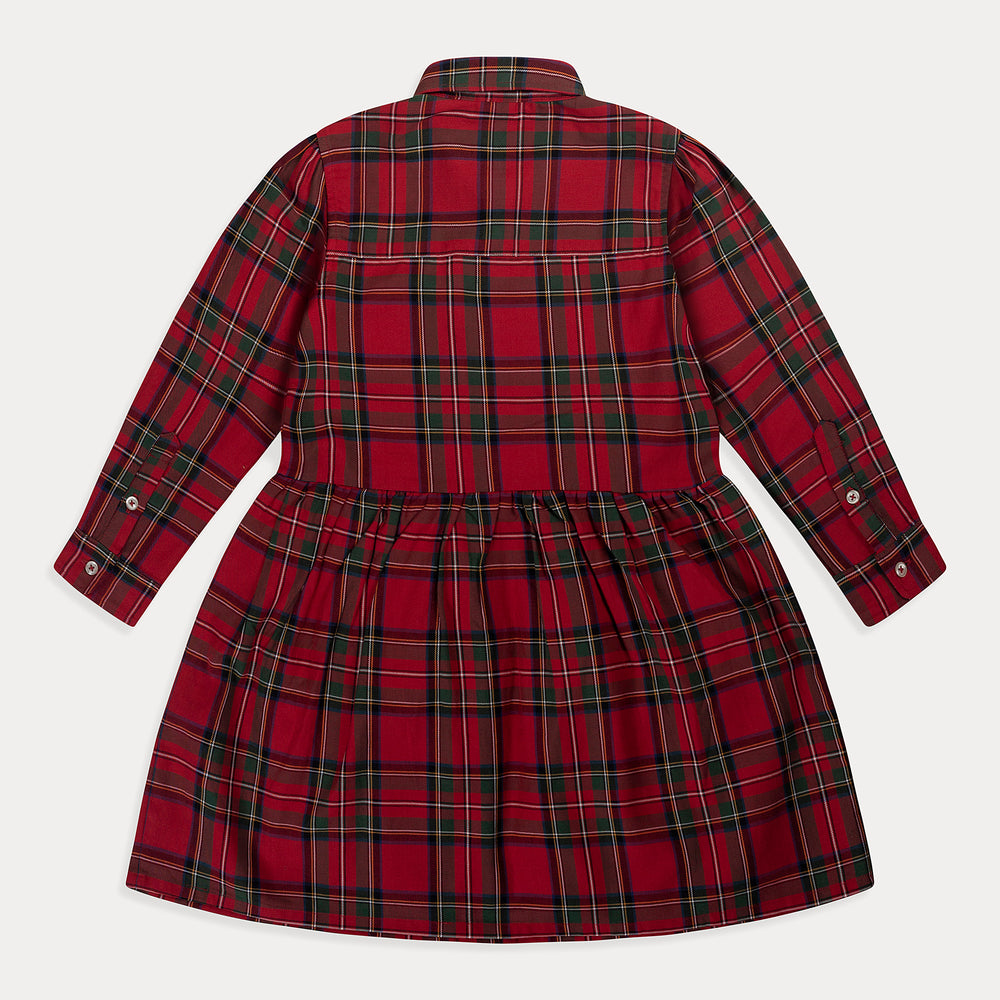 Get your little one ready for the holidays with our Christmas Dress! This red long sleeve girls dress features a royal Stewart tartan pattern, perfect for festive occasions, available in sizes 2T-7 years.