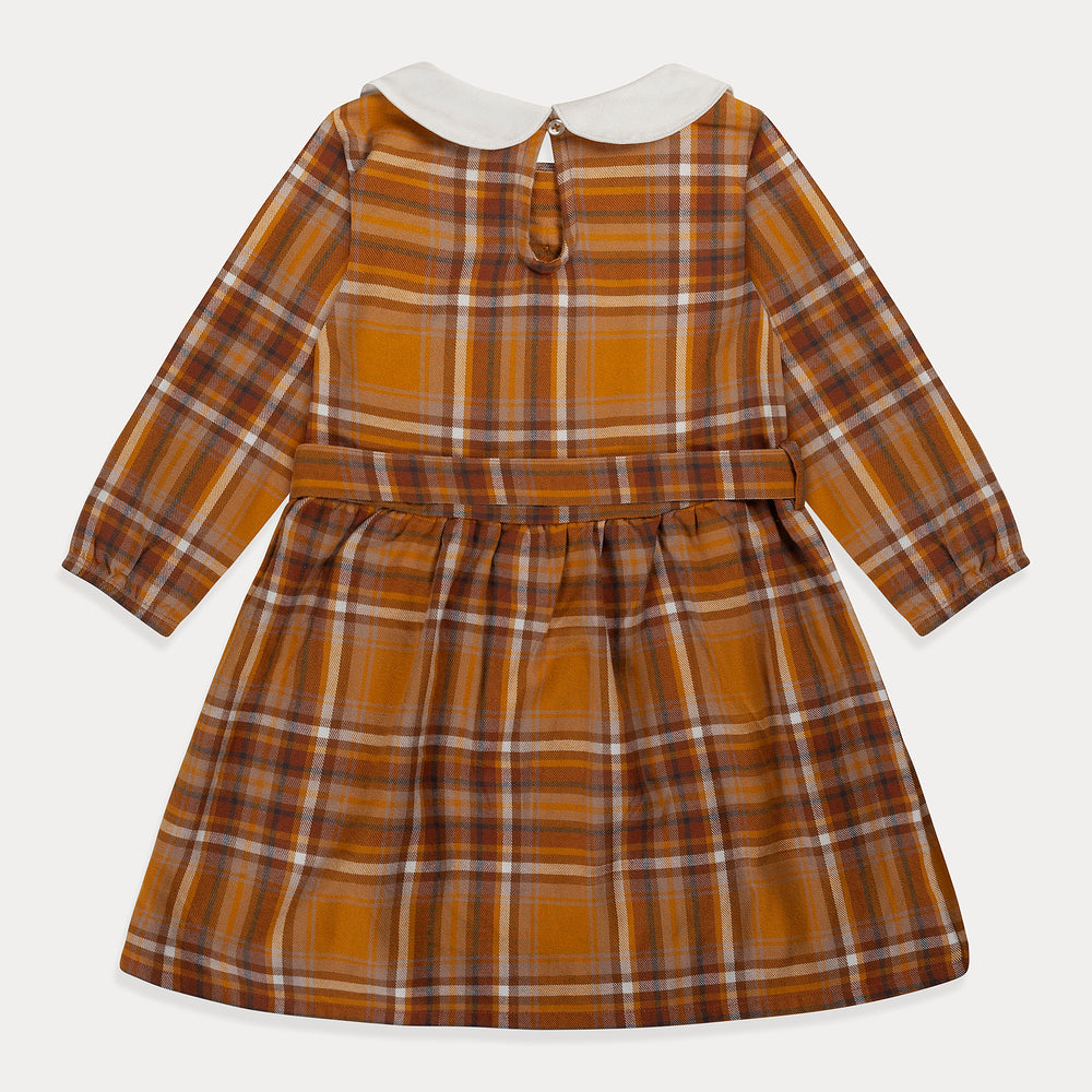Add a touch of warmth to your little one's wardrobe with our Toddler Dress! This plaid long sleeve flannel cotton belted dress in terracotta brown is perfect for fall, offering comfort and style in sizes 2T-7 years.
